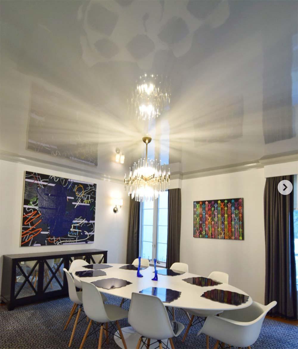 One of the recent trends for ceilings is high gloss reflective finishes. The ultra glossy ceiling design painted in light colors makes the viewer's eyes feel the room is spacious. This design is perfect for small living or dining areas.